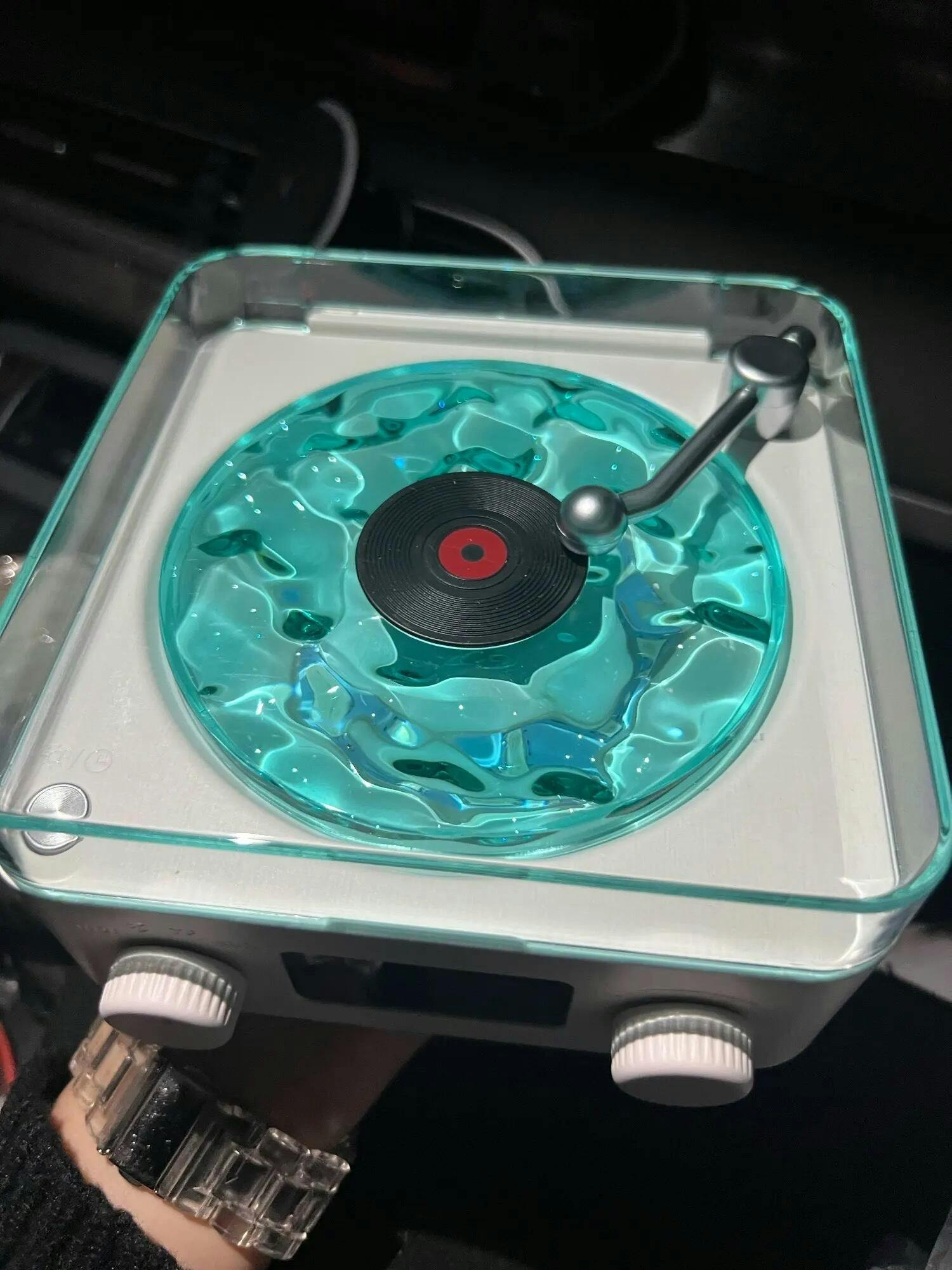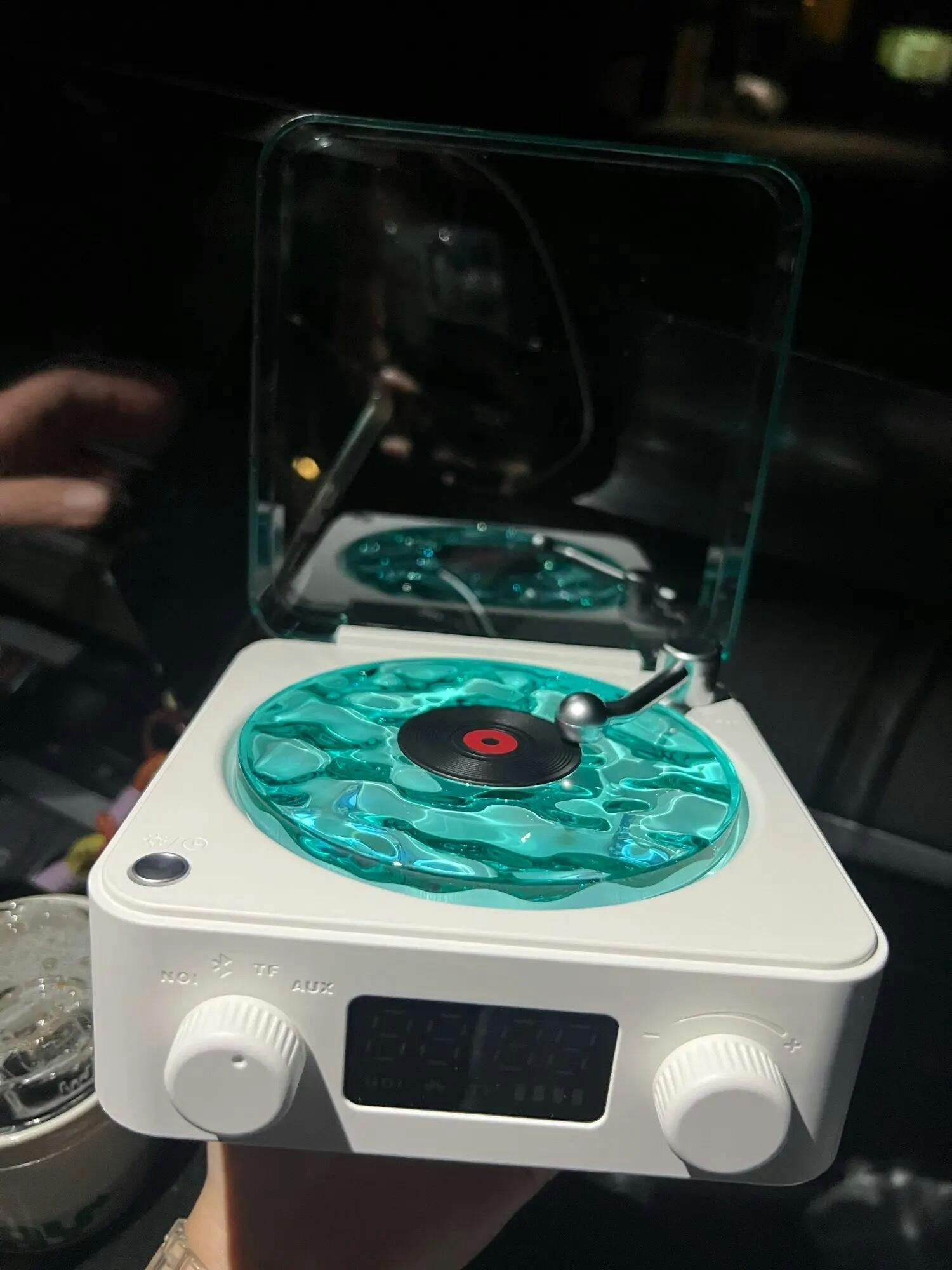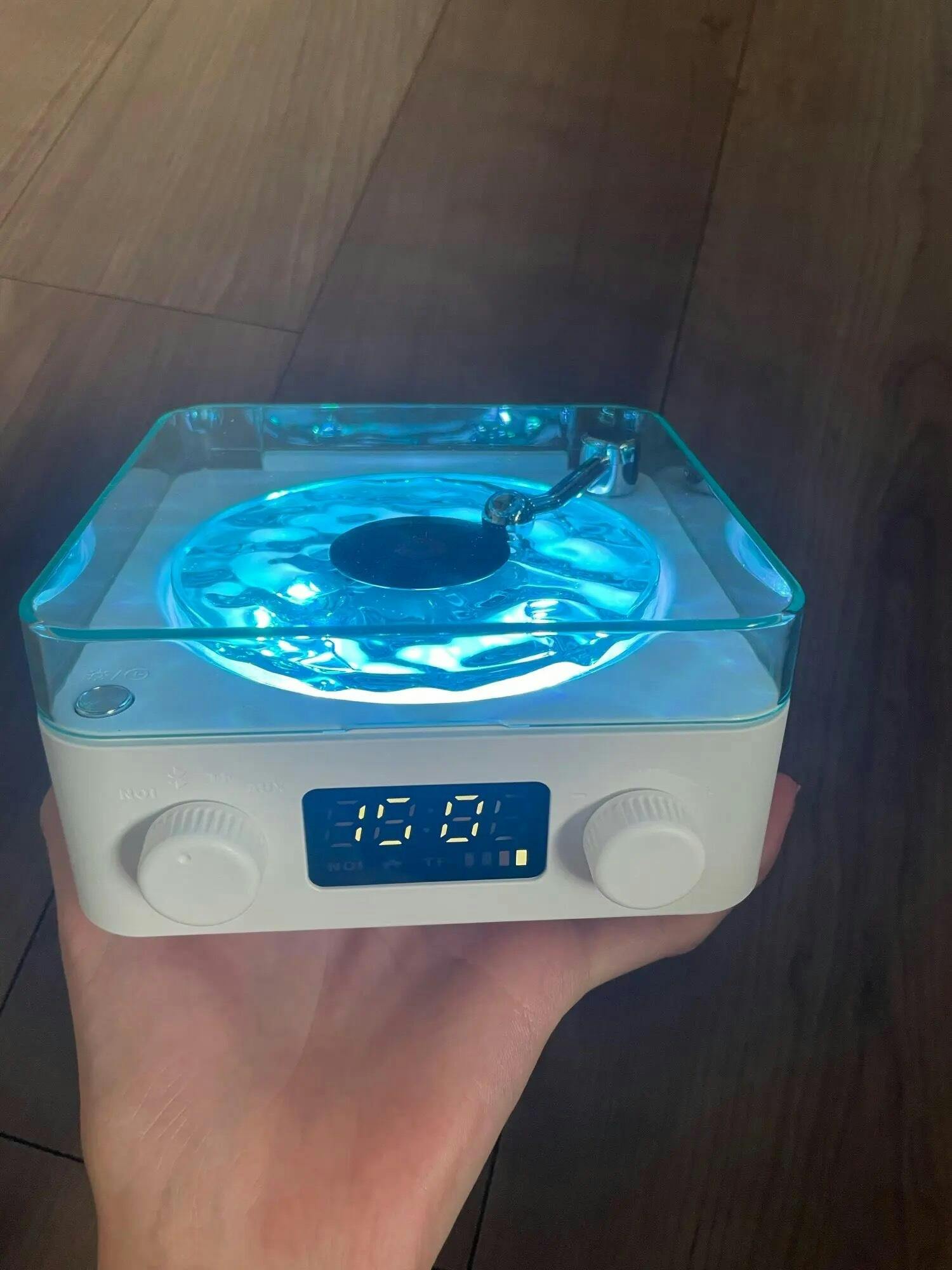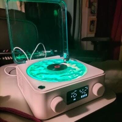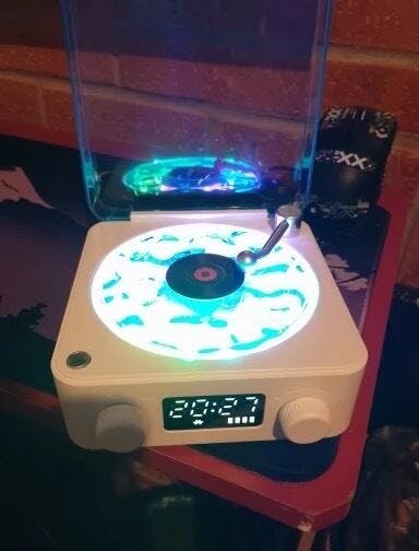 L'ho visto su TikTok e l'ho comprato. Sono rimasto sorpreso perché era più grande di quanto pensassi. Sono soddisfatto. È carino poter ascoltare musica con il colore della giradischi che riflette anche sui muri e soffitto.